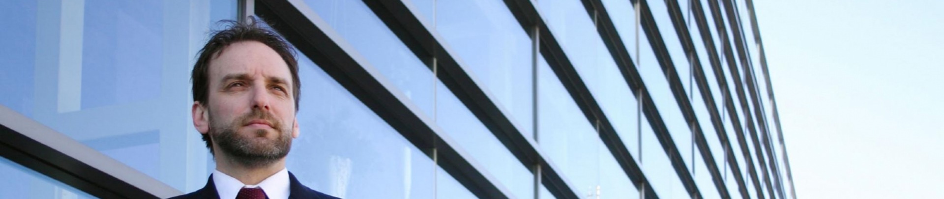 • Man met snor en baard in pak staat voor glazen kantoorpand